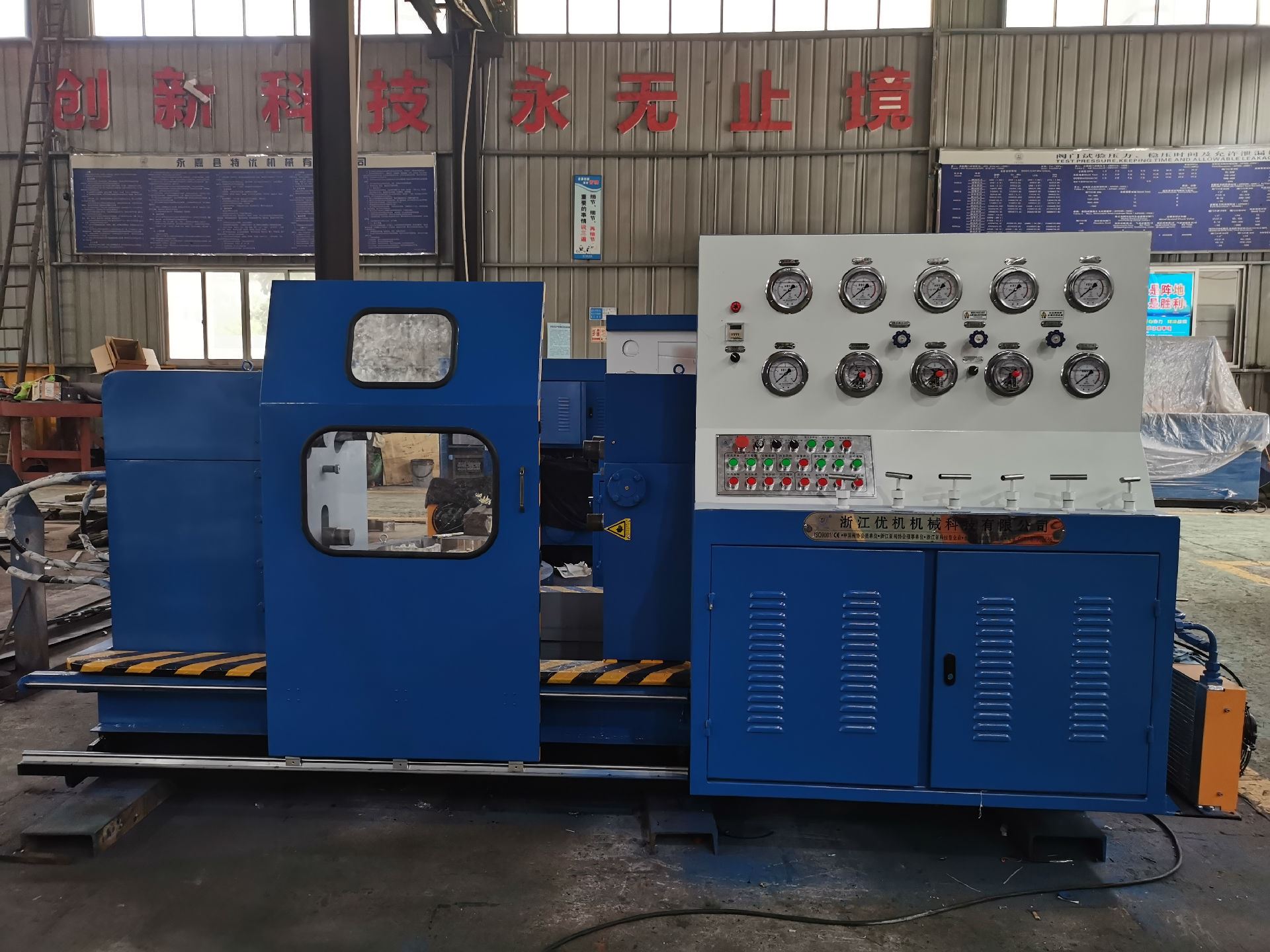 本機集機電、液壓、試壓、液體介質貯存循環使用于一體,具有功能完善、性能穩定、自動化程度高等特點。廣泛用于公稱通徑DNl 5-1000mm的直通式法蘭及螺紋連接各類高、中、低壓閥門的強度、密封和泄漏量等各項性能測試。測試介質:水、氣、油。最高密封試驗壓力 32.0MPa,強度48 0MPa。